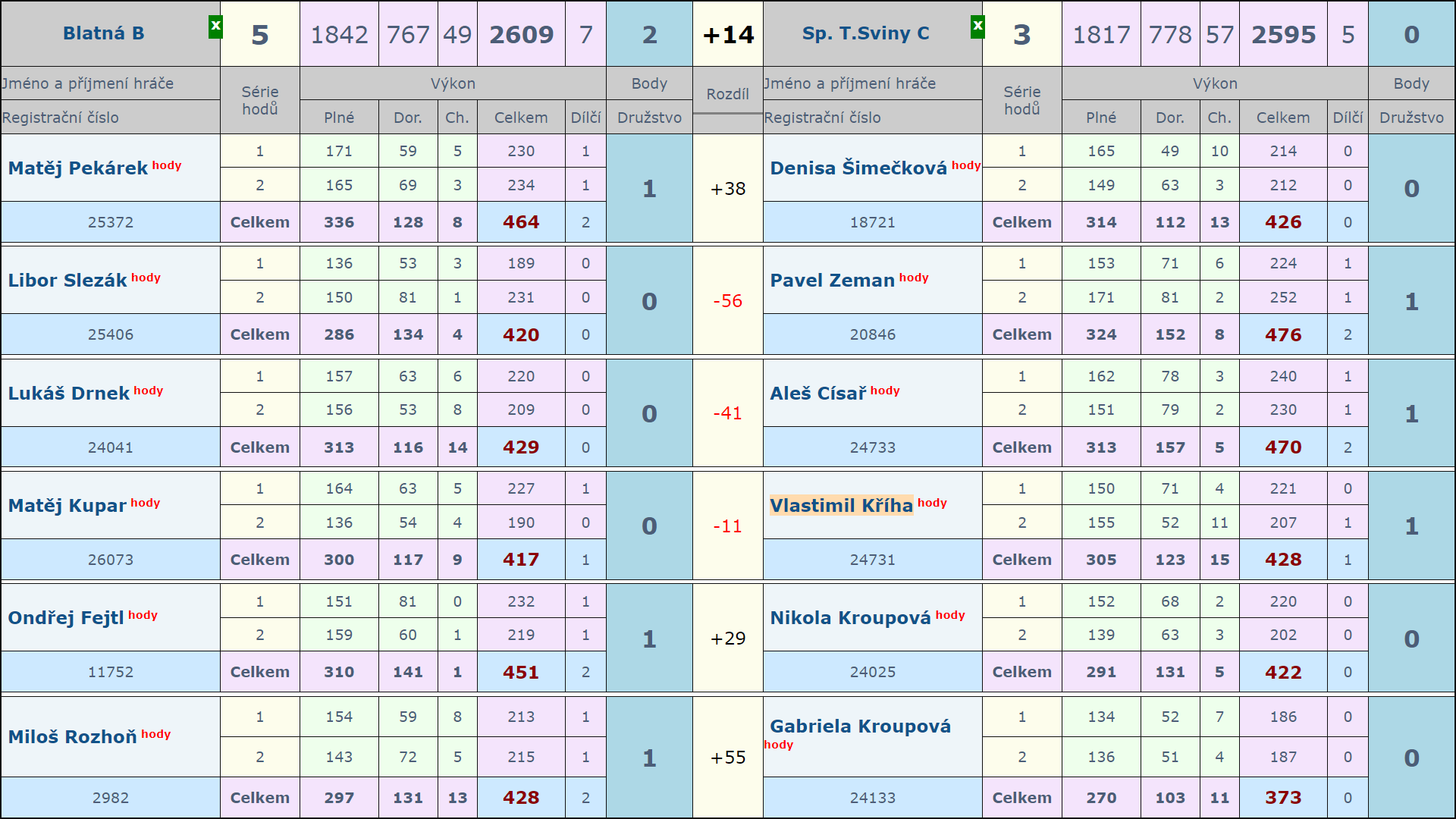 Poté hráli Lukáš Drnek a Matěj Kupar. Lukáš se celkovou hrou spíše protrápil (220+209), hlavně dorážka byla slabá, a především kvůli ní prohrál 429:470. Matěj měl výbornou první dráhu (227), na čtyřce však polevil (190) a celkově na soupeře nestačil o kousek 417:428. V této fázi zápasu bylo skóre 1:3 a +70 kuželek pro Sviny.