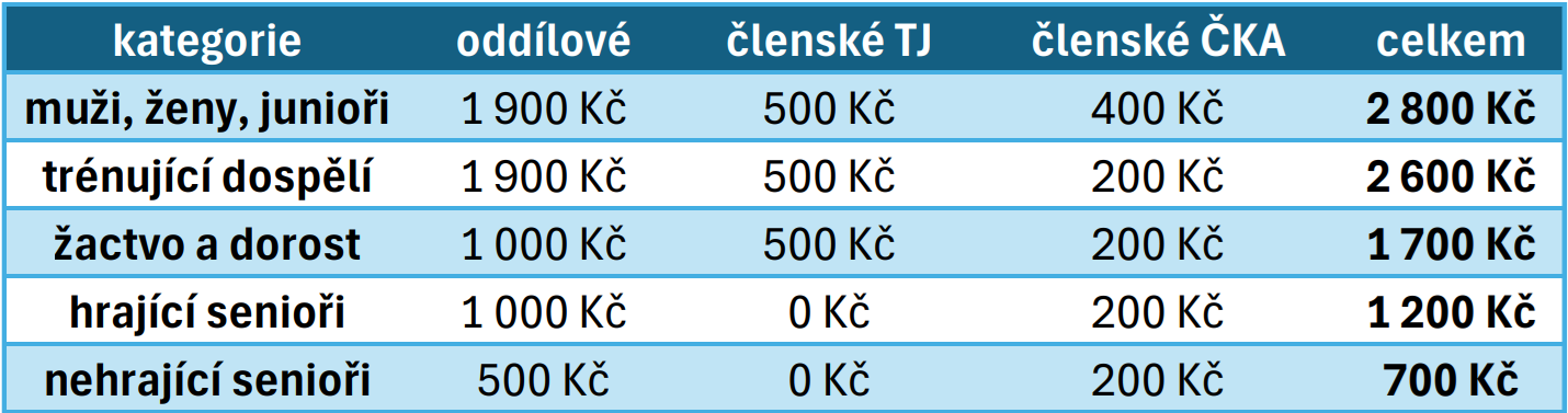 Nejdůležitější je příspěvek ČKA, který MUSÍ být uhrazen do 31.1.2026, pak je start v soutěži neoprávněný. Ideální bude, aby byly příspěvky, zejména registrovaných hráčů, uhrazeny do 25.1.2026, aby mohly hrát soutěže.