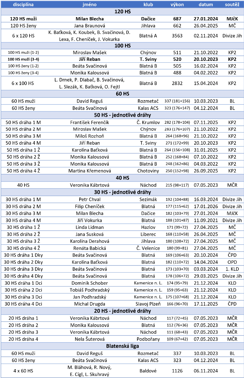 Na této stránce jsou uvedeny rekordy blatenské kuželny, které jsou k dispozici v online systému kuželky.com a z výsledků, které se mi podařilo najít. Pokud víte o tom, že jakýkoliv rekord má jinou hodnotu, budu velmi rád, když se mi ozvete na mail drnek.lukas@seznam.cz. Do zprávy prosím o jméno hráče, oddíl, datum i typ soutěže. Předem děkuji za spolupráci.